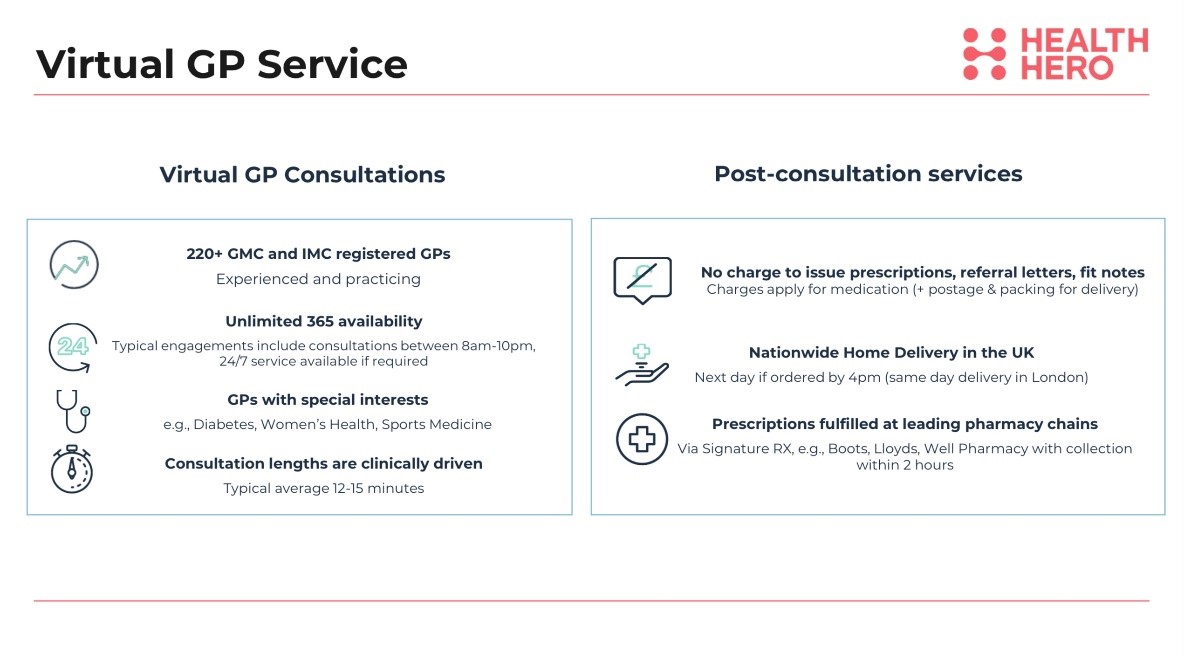 Where necessary our GPs can issue a private prescription for collection from a pharmacy or delivered to any UK address, whether at home, work or on holiday. If one of our NHS practising doctors considers symptoms require further investigation or treatment, our doctors can issue an open private referral letter to enable access to continued treatment. If it is clinically appropriate, our GPs can also issue private fit notes.